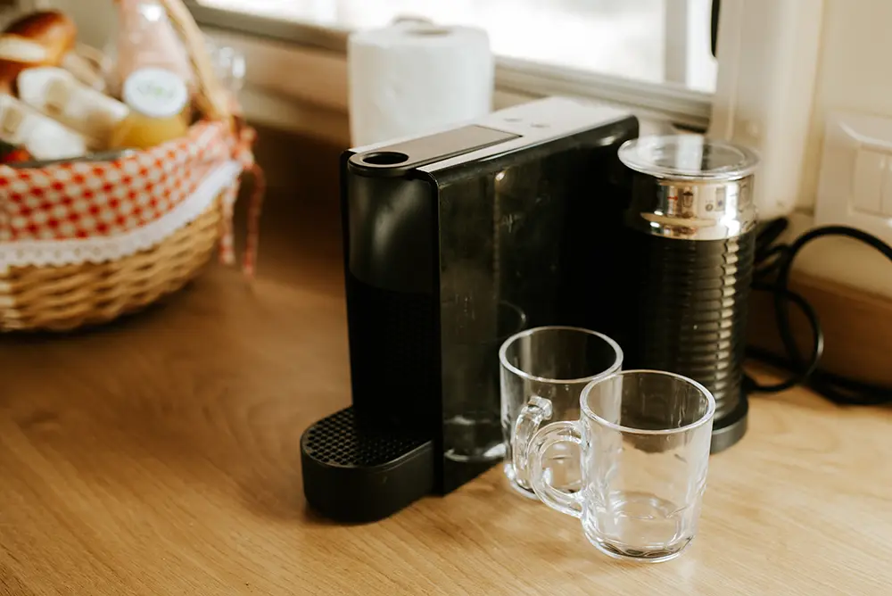 מטבח מאובזר ומפנק עם מקרר גדול ומכונת קפה